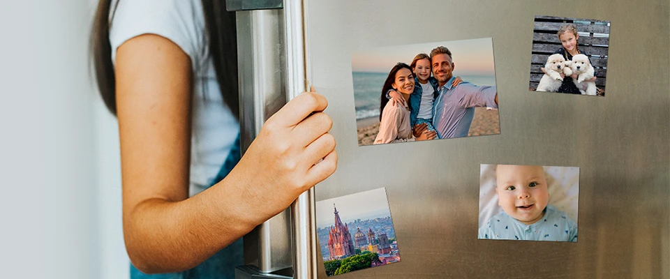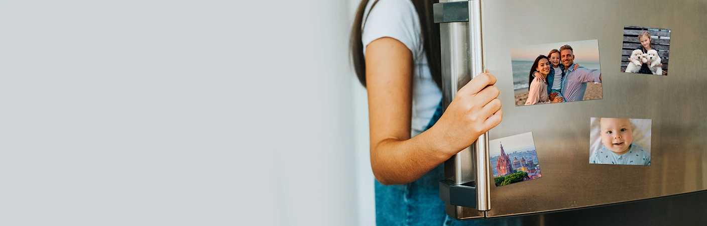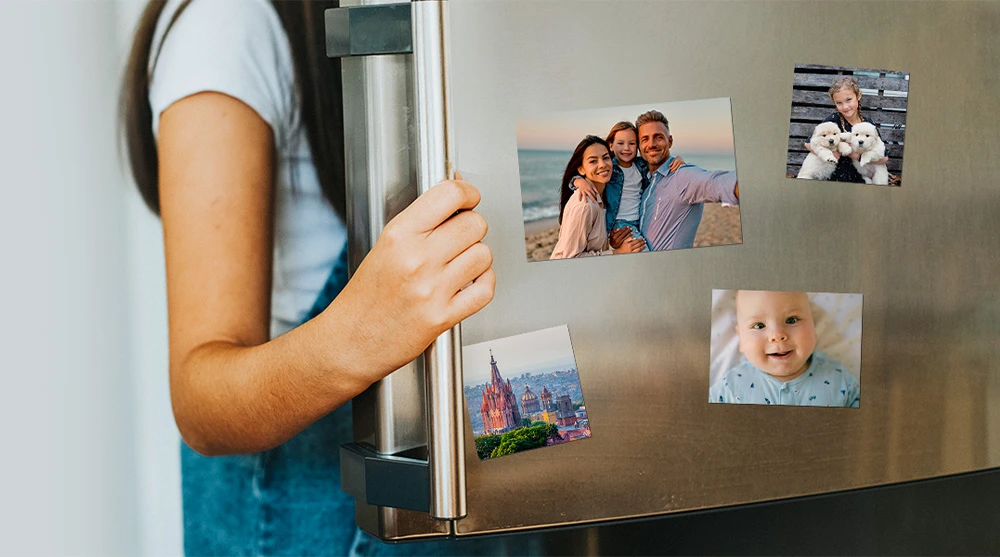 Keep special memories visible every day with custom photo magnets in multiple sizes. Perfect for fridges and lockers. Order through Verizon for same-day pickup or home delivery. Available in 4x6, 5x7, and 5x5 sizes.